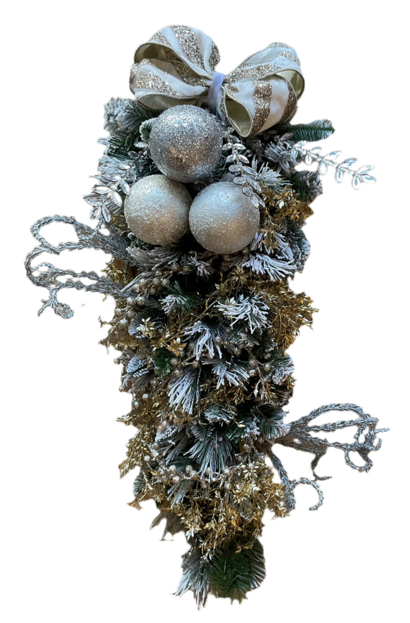 Three-foot-long flocked teardrop swag decorated in a glittering gold and white theme with dazzling jewel accents.