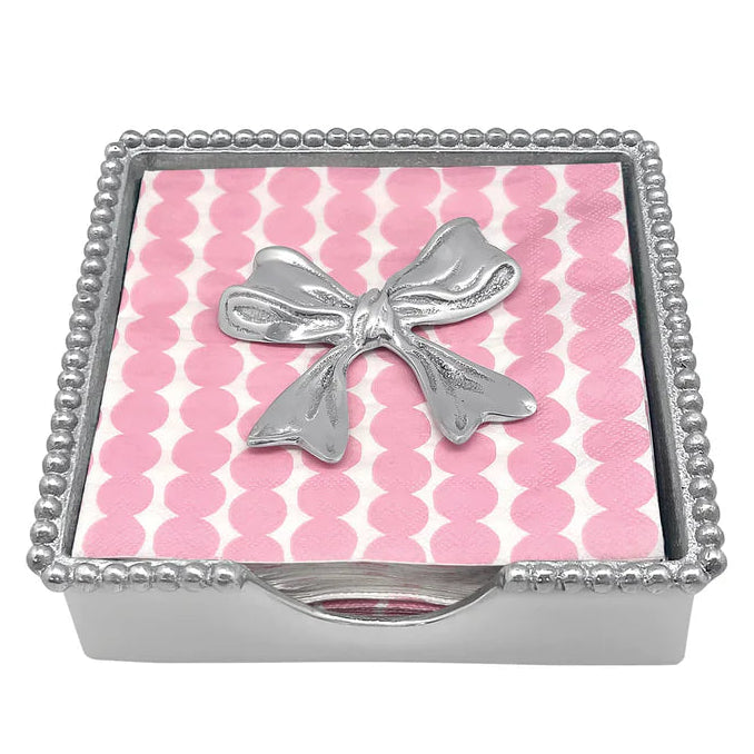 The BOWtique Collection, where elegance meets charm in every detail. Add a touch of glamour to your table with the Bow Beaded Napkin Box Set. A charming Bow Napkin Weight sits atop a playful pink cocktail napkin, held together in a Beaded Napkin Box. Handcrafted from 100% recycled, buffed-until-brilliant aluminum.