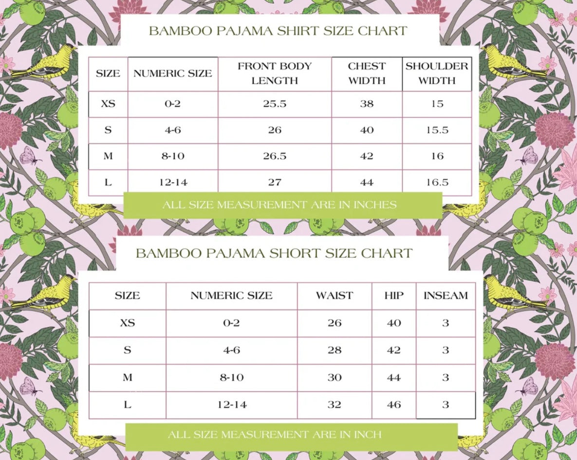 Our pajamas are made with 95% Bamboo and 5% Spandex for a non-shrinking, super-soft fit. All pajamas are made to fit a little loose for comfort, but run true to size. Please see size chart for more information.
