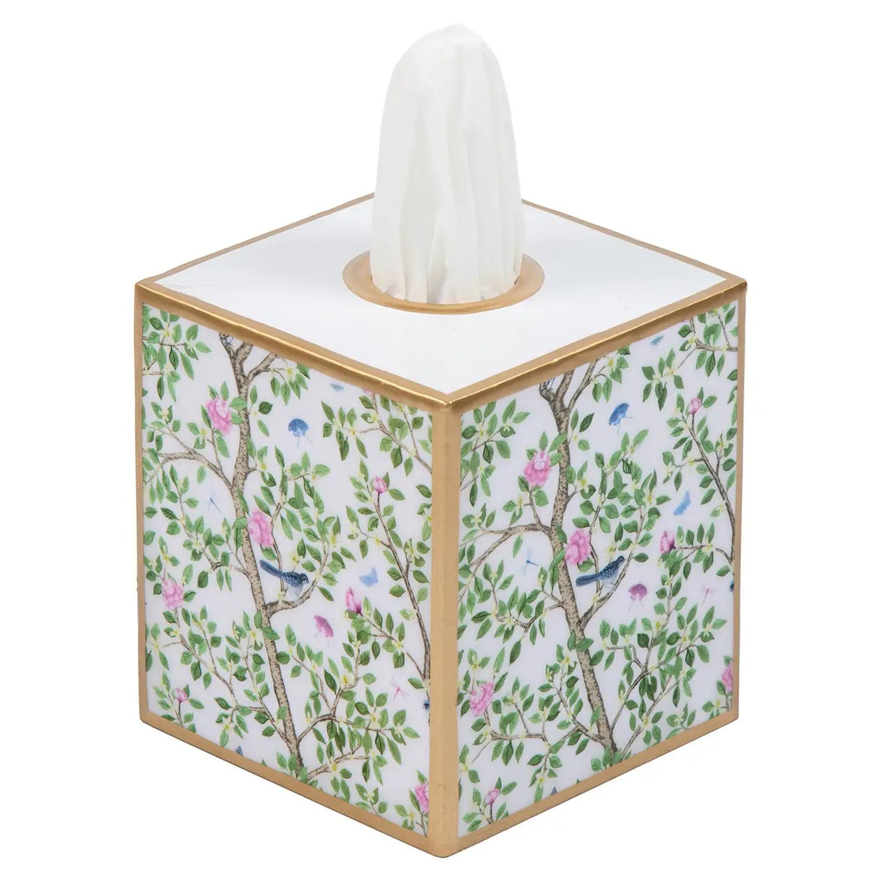 Elsie's Garden Enamel Tissue Box cover 5.5"w x 5"h in blue and pink.