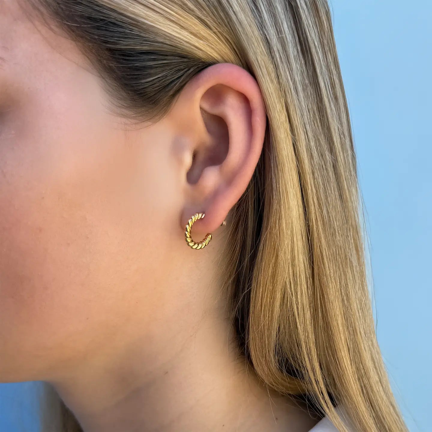 Small, gold plated hoop earring with twist detail. 1/2" inside diameter 1/8" width Post backing Surgical steel posts