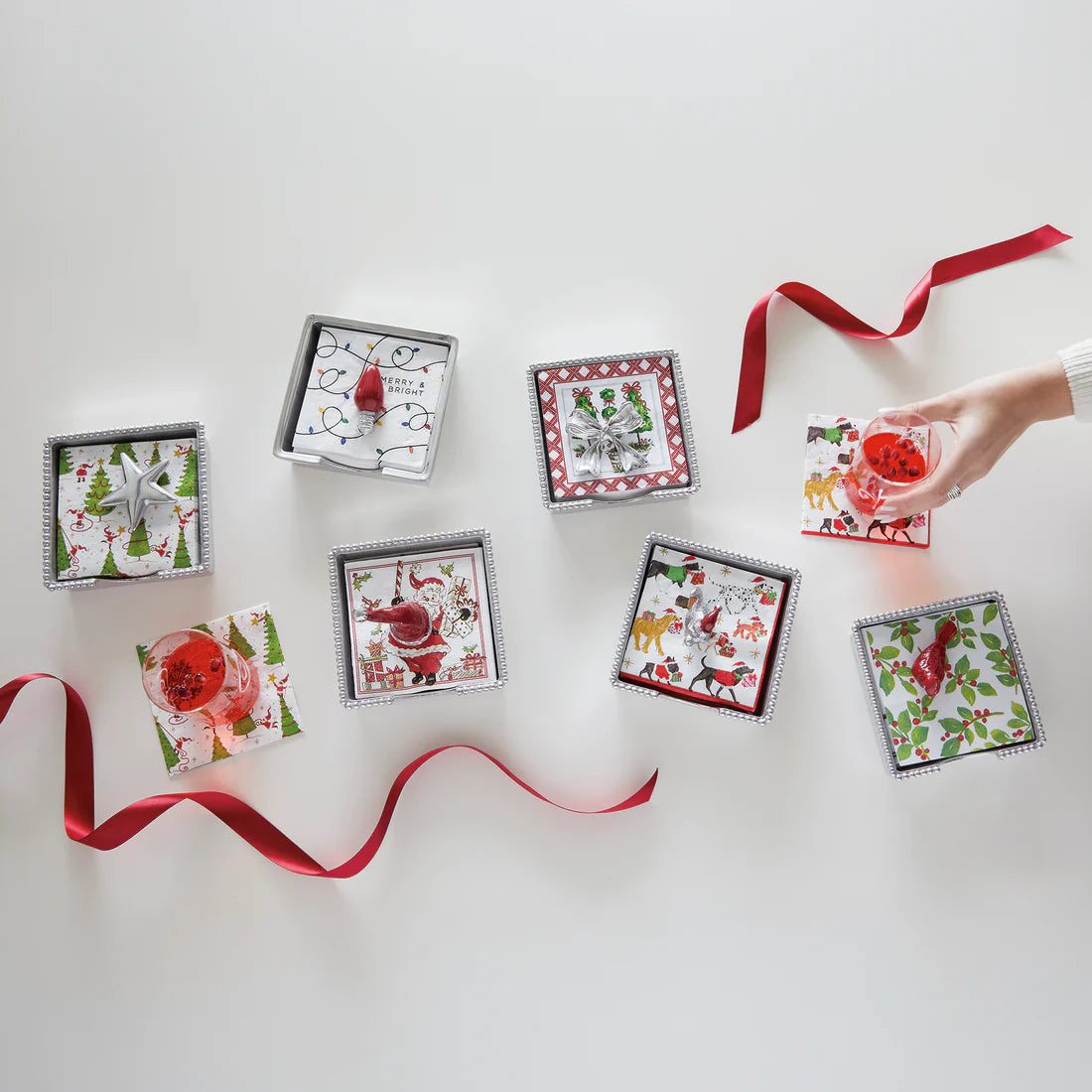 A festive enameled Red Santa Hat Beaded Napkin Box, adorned with a stack of jolly Santa cocktail Napkins and an artfully designed red and silver Red Santa Hat Napkin Weight adds a little winter magic to your next cocktail or holiday party. Red Santa Hat Beaded Napkin Box is handcrafted from 100% recycled aluminum.