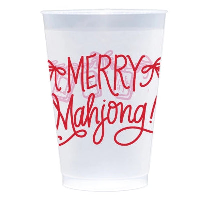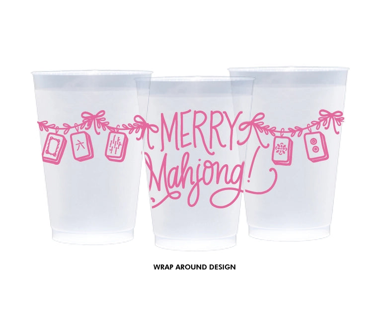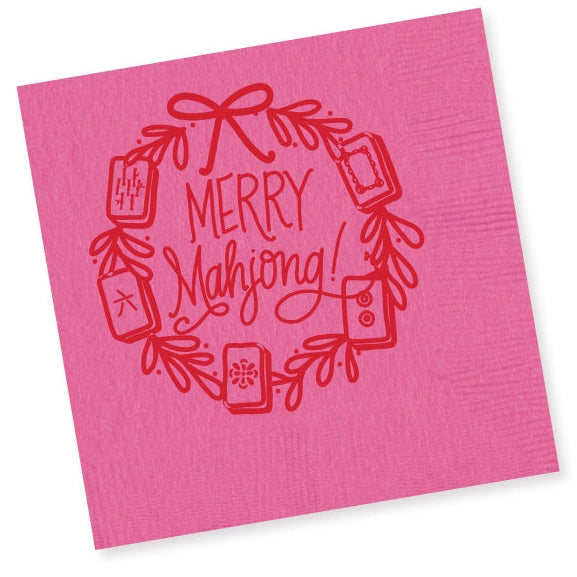 "Merry Mahjong" (because we love a great game with snacks!) handwritten with a cute drawing of garland with mahjong tiles (and bows!) - all printed on cups and napkins in festive and mat-matching colors