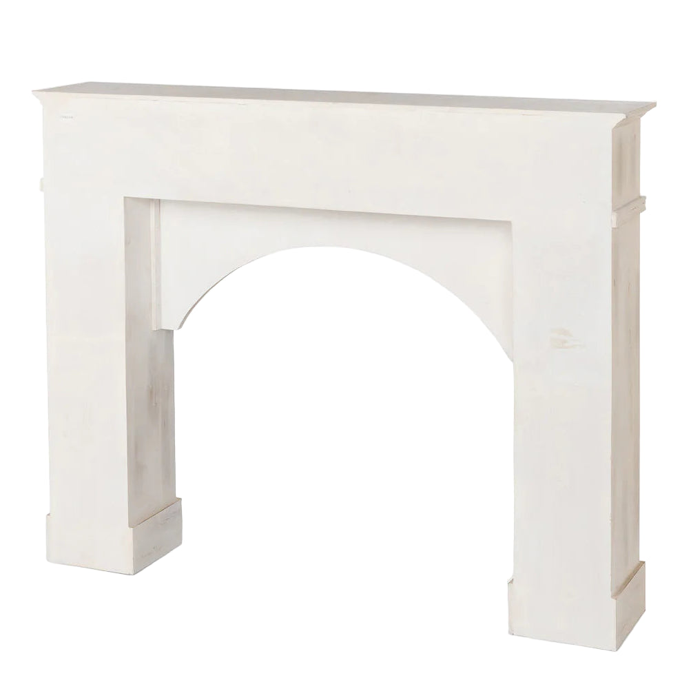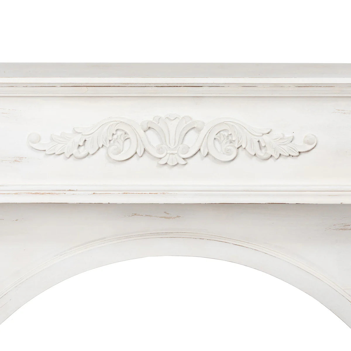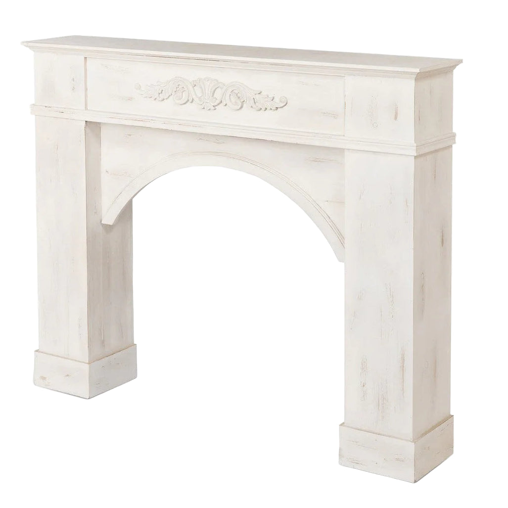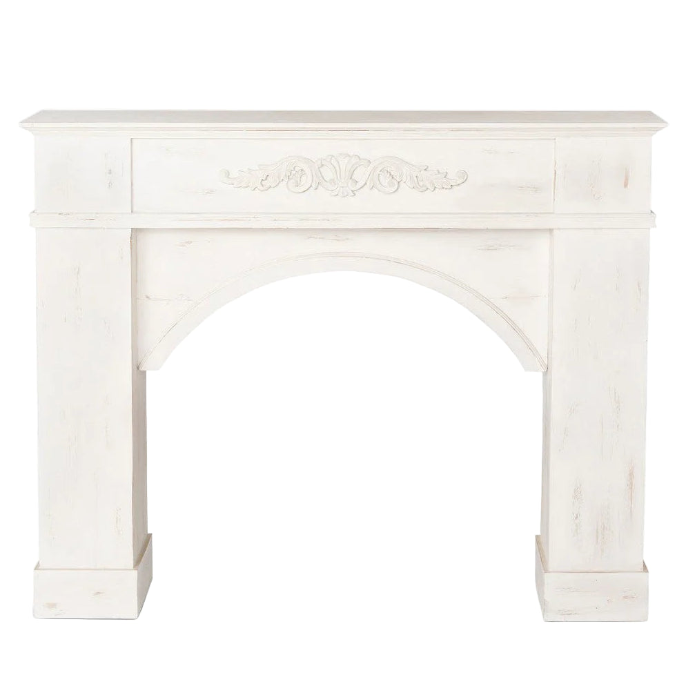 Quaint and charming, this diminutive fireplace mantel is a perfect display piece for a boutique but would be right at home in a cottage home. It's whitewash finish and carved design are reminiscent of a French Chalet.