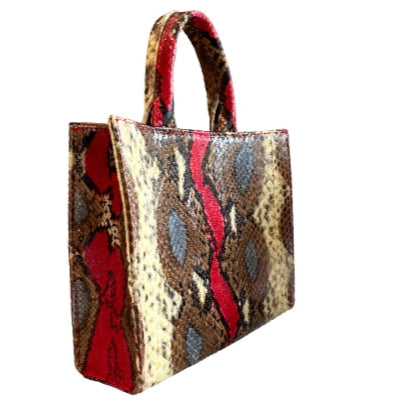 Handcrafted from genuine snakeskin, the Adelaide red and black accented python is a luxury version of our classic bestselling leather handbag, featuring the same structured form and understated elegance as the original. Perfect for everyday use, the Adelaide also functions as a crossbody purse with its detachable python strap. Hand-painted for color, with a coordinating suede lining.