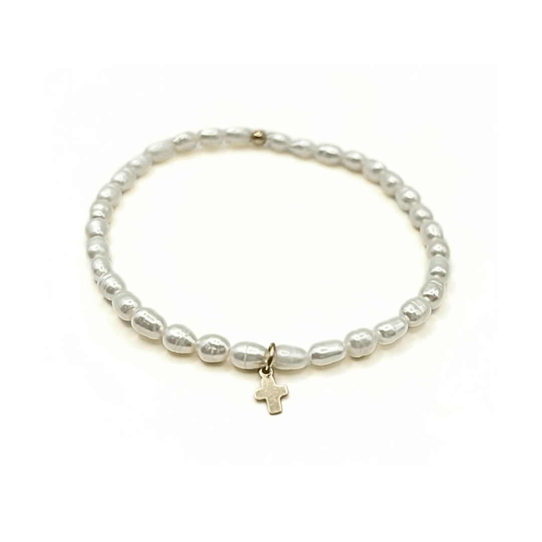 Petite, natural, rice pearl bracelet with a 14k gold-filled luxe cross. This is the sweetest bracelet that will be sure to be a favorite for anyone. Wear single or stack it. Part of our erin gray waterproof collection. Available in 6.5 " or 7" bracelet sizes.