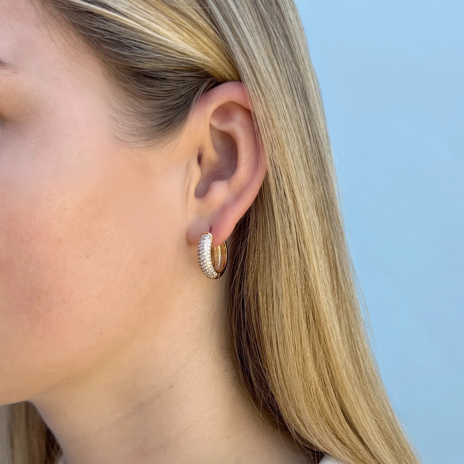 Gold hoop earring with clear rhinestones.