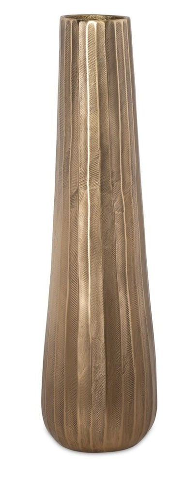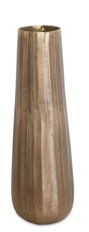 Set of two cast aluminum vases, adorned with heavily textured ridges and finished in an oxidized antique gold, seamlessly blend vintage charm with contemporary allure.