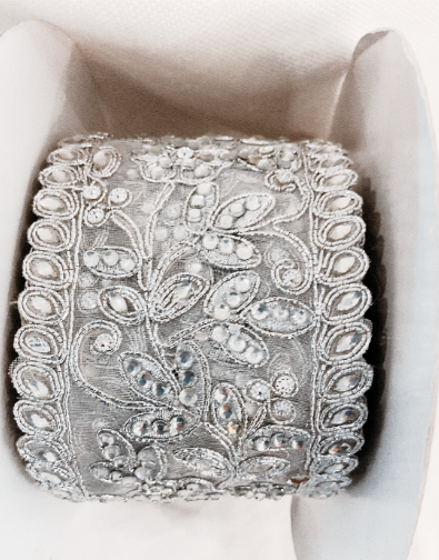 2 1/2" wide jeweled ribbon. Sheer silver background, wired.